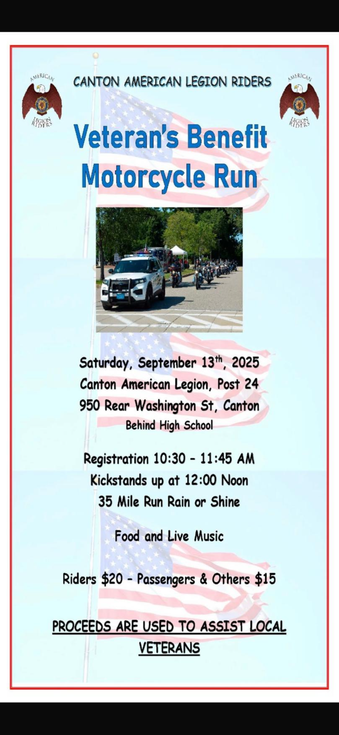 On Saturday September 13th, 2025, the Canton American Legion Riders will be hosting a Veterans Benefit Motorcycle Run fund raising event in support of local veterans.